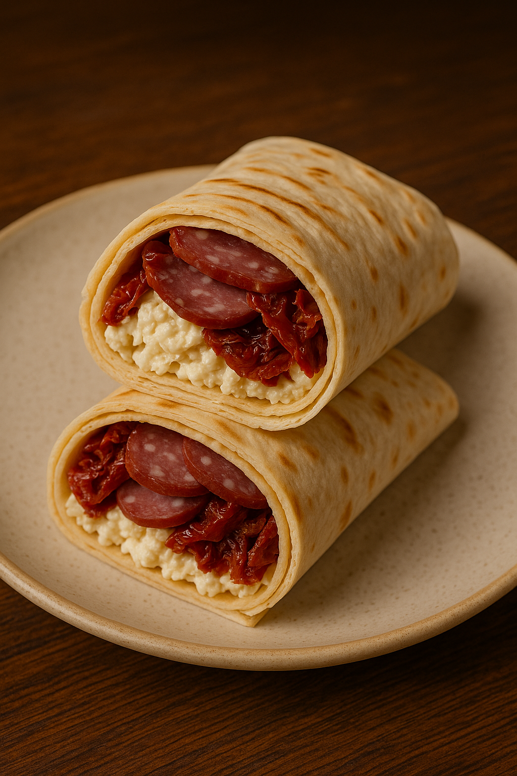 Wrap de brânză de burduf, roșii uscate și salam de vânat